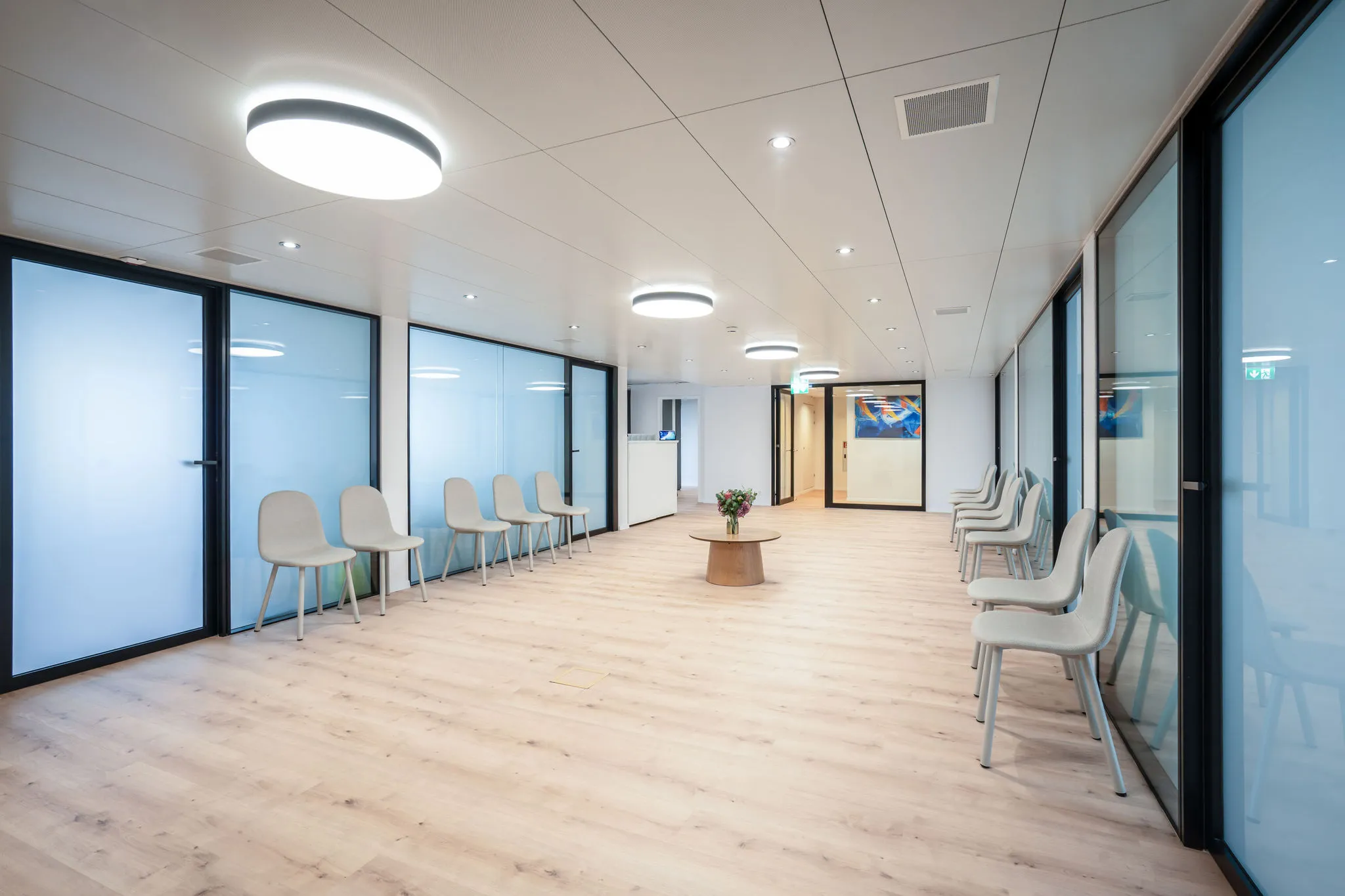 Die Raumstrukturen wurden neu gegliedert: elegante Glastrennwände schaffen Transparenz im Wartebereich, während klar definierte Behandlungszimmer für Ruhe und Diskretion sorgen. Ergänzte Kühldecken sorgen für ein angenehmes Raumklima – auch bei hoher Auslastung.